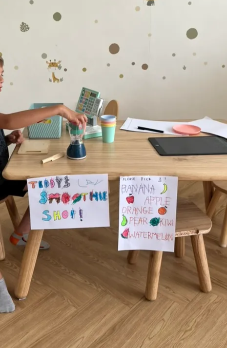 Last week, we decided to put everything he has learned into practice in a role-play scenario. Together we created a little smoothie shop - complete with a custom menu - and a safe space to start exploring what these conversations might look like in the real-world. We lined up all of the plushies we could find and set them up as customers. He was able to walk into the café, greet the “person” behind the counter, ask what flavours were available, make small talk while he waited, pay, and say goodbye, all within a full and functional back and forth conversation. He can read when it is his turn to speak. He knows how to show someone he is listening. And he is proud of it!